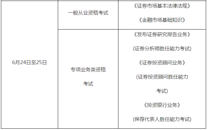 2017年6月证券从业资格考试报名安排5个科目。其中,一般从业资格考试科目有:金融市场基础知识和、证券市场基本法律法规。证券专项业务资格考试科目有:发布证券研究报告业务、证券投资顾问业务、投资银行业务。